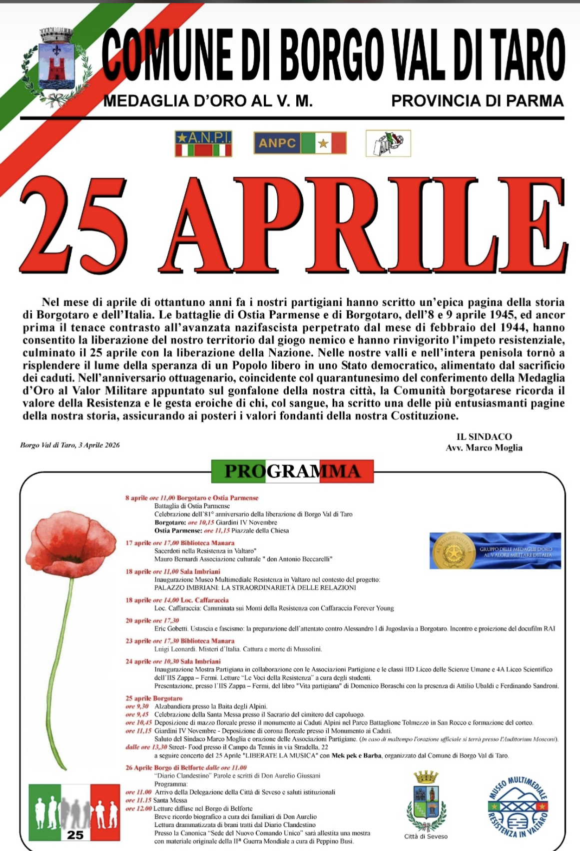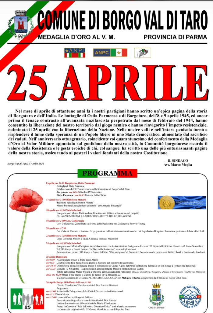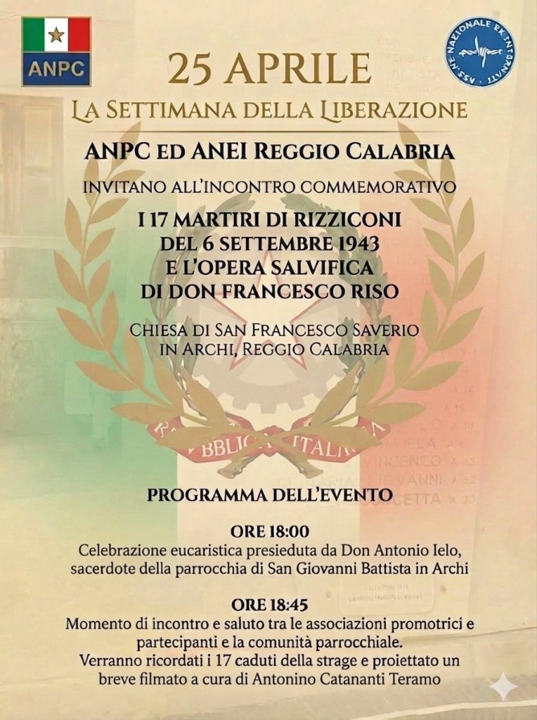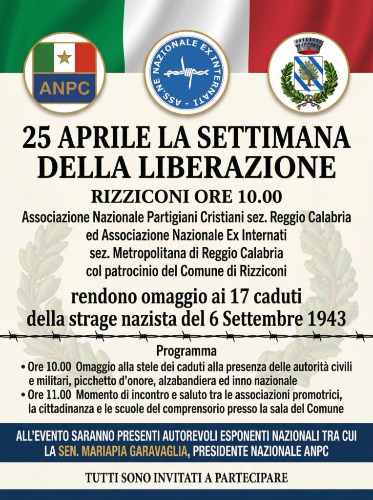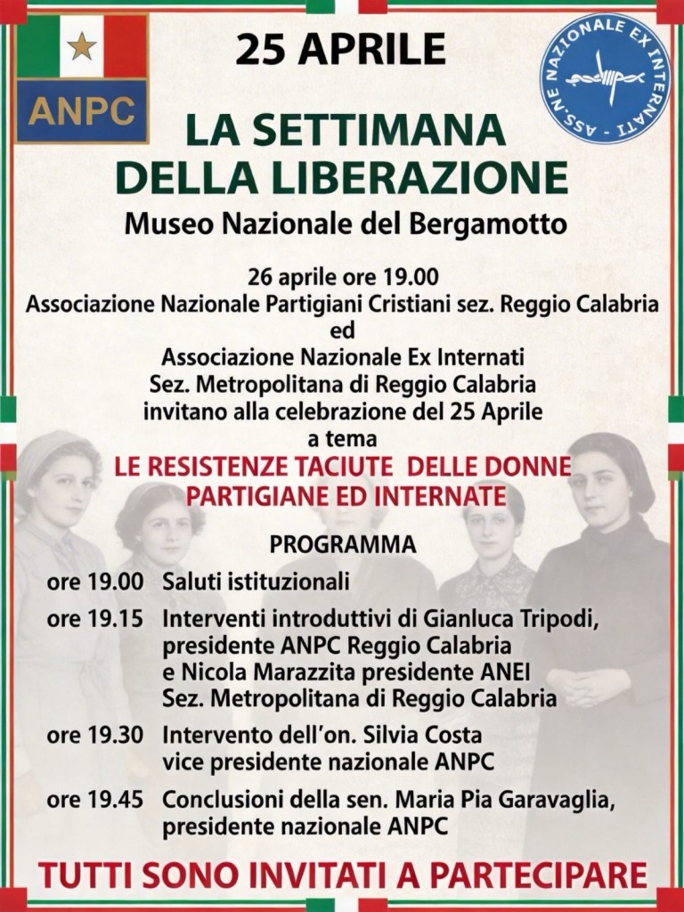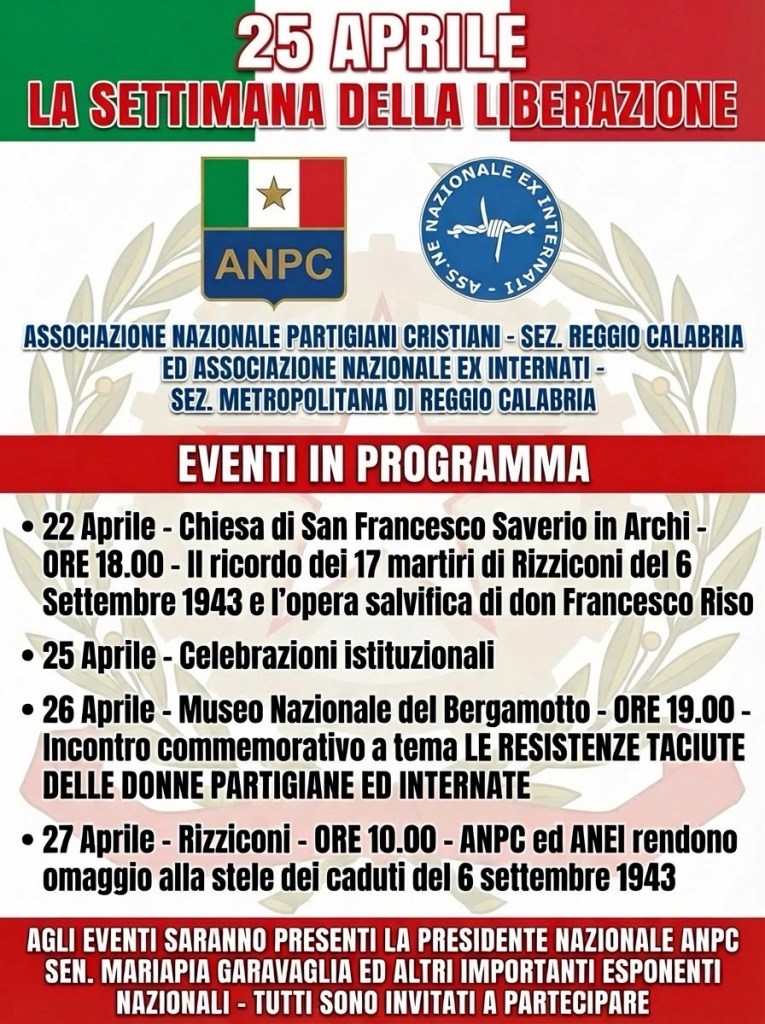 Pubblichiamo il programma delle iniziative per festeggiare “Il nostro 25 aprile” che quest’anno avrà come sede Reggio Calabria.