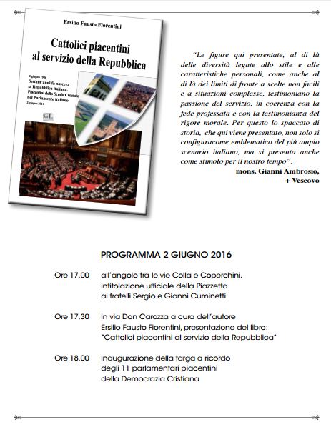 2 Giugno 2016: 70° della Repubblica; Manifestazione dell’Associazione Nazionale Partigiani Cristiani di Piacenza