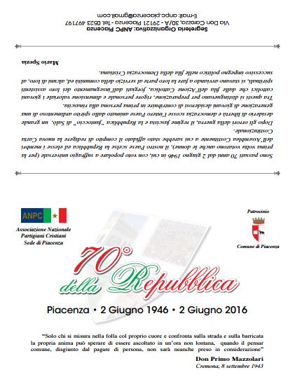 2 Giugno 2016: 70° della Repubblica; Manifestazione dell’Associazione Nazionale Partigiani Cristiani di Piacenza