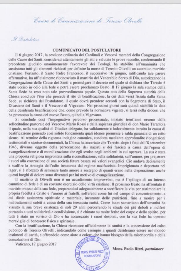 comunicato postulatore teresio