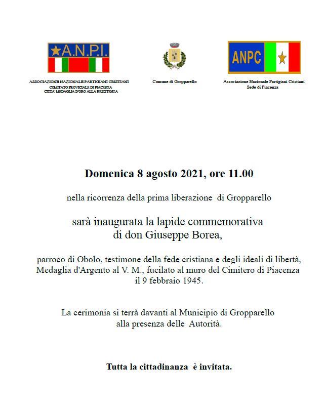 Il Presidente della Sezione di Piacenza, Mario Spezia, ci scrive: “La nostra sede di Piacenza sta da tempo lavorando, tra le varie iniziative, per ricordare e rendere onore ai 6 sacerdoti della Diocesi di Piacenza uccisi barbaramente durante il periodo resistenziale; in particolare, per la ferocia con cui sono stati uccisi, seguiamo il martirio di don Giuseppe Beotti e di don Giuseppe Borea. Per don Giuseppe Beotti è stato avviato, da tempo, il processo di beatificazione che superata positivamente la fase diocesana, è ora al vaglio della Congregazione dei Santi in Vaticano. Per don Giuseppe Borea, fucilato dopo un processo farsa il 9 febbraio 1945, in collaborazione con il comitato spontaneo che si è riunito per farne memoria, abbiamo organizzato diverse manifestazioni e aiutato la produzione di libri e testi sulle sue opere. Sempre a suo ricordo il prossimo 8 agosto si terrà presso il Comune di Gropparello, in provincia di Piacenza, località nella quale si trova la parrocchia di Obolo, dove don Giuseppe Borea esercitava durante la Resistenza la propria opera spirituale, una manifestazione durante la quale verrà apposta una targa a ricordo del suo sacrificio”. Qui l’invito per l’inaugurazione della lapide commemorativa di don Giuseppe Borea: