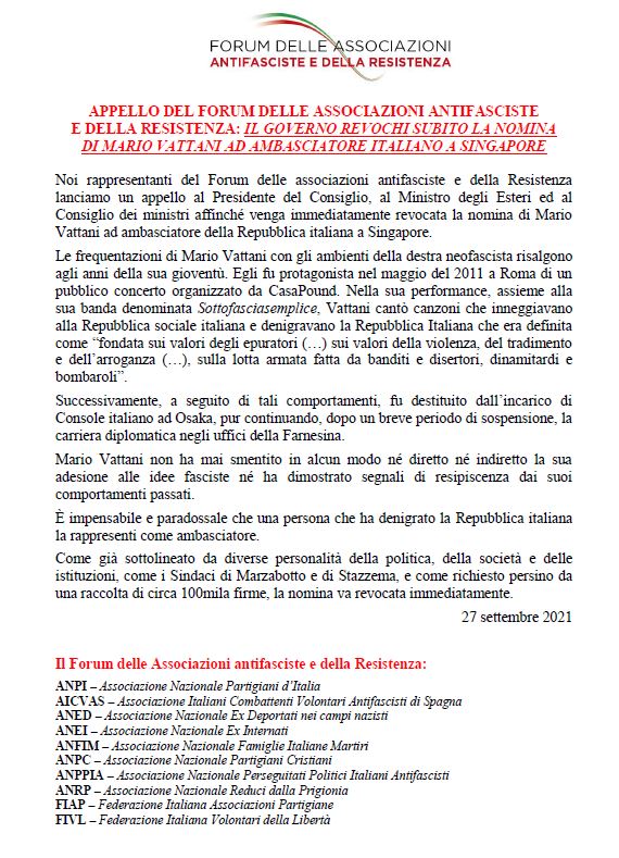 Noi rappresentanti del Forum delle associazioni antifasciste e della Resistenza lanciamo un appello al Presidente del Consiglio, al Ministro degli Esteri ed al Consiglio dei ministri affinché venga immediatamente revocata la nomina di Mario Vattani ad ambasciatore della Repubblica italiana a Singapore. Le frequentazioni di Mario Vattani con gli ambienti della destra neofascista risalgono agli anni della sua gioventù. Egli fu protagonista nel maggio del 2011 a Roma di un pubblico concerto organizzato da CasaPound. Nella sua performance, assieme alla sua banda denominata Sottofasciasemplice, Vattani cantò canzoni che inneggiavano alla Repubblica sociale italiana e denigravano la Repubblica Italiana che era definita come “fondata sui valori degli epuratori (…) sui valori della violenza, del tradimento e dell’arroganza (…), sulla lotta armata fatta da banditi e disertori, dinamitardi e bombaroli”.
