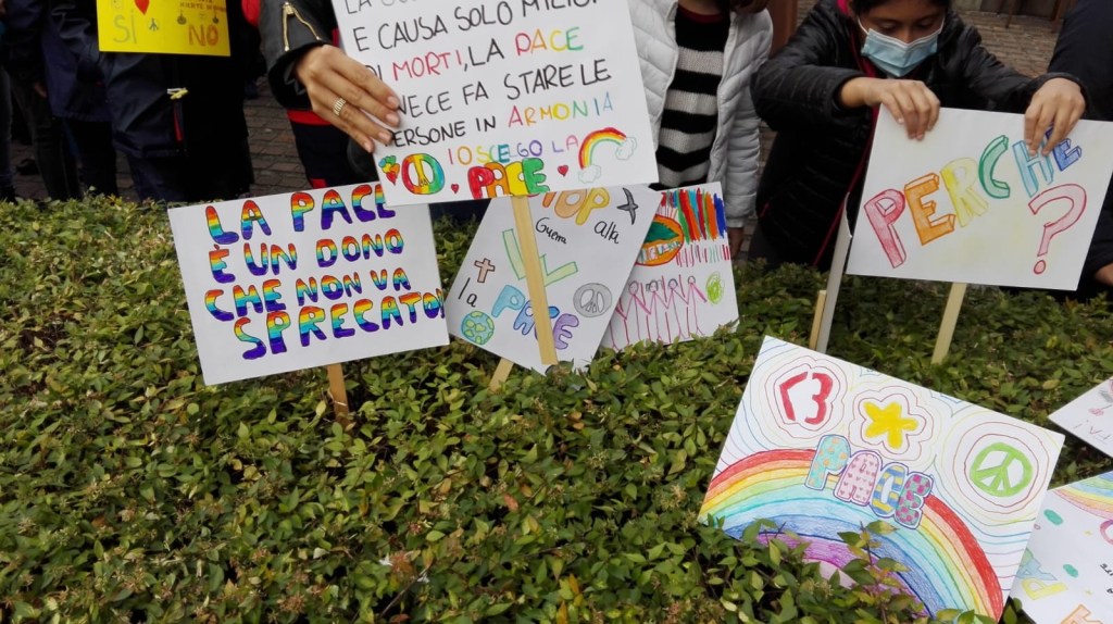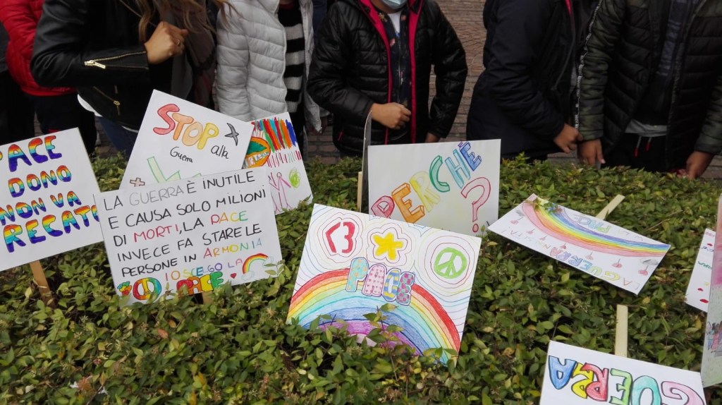 I bambini sono stati i veri animatori della speranza suscitando un fuori programma. Tutti i relatori istituzionali hanno voluto che salissero sul palco con i loro cartelli incisivi, semplici. Come i profeti nei loro cartelli i bambini sono stati concreti non astratti: “La pace è un dono che non va sprecato”, “La guerra è inutile e causa solo milioni di morti. La pace invece fa stare le persone in armonia”, “Perché?”, “Nella guerra non esiste un vincitore, noi vogliamo solo un mondo migliore”, “Noi bambini dobbiamo sapere che esiste la pace, non che esiste la guerra. La pace è la cosa più bella che c’è non dobbiamo distruggerla con le guerre”.