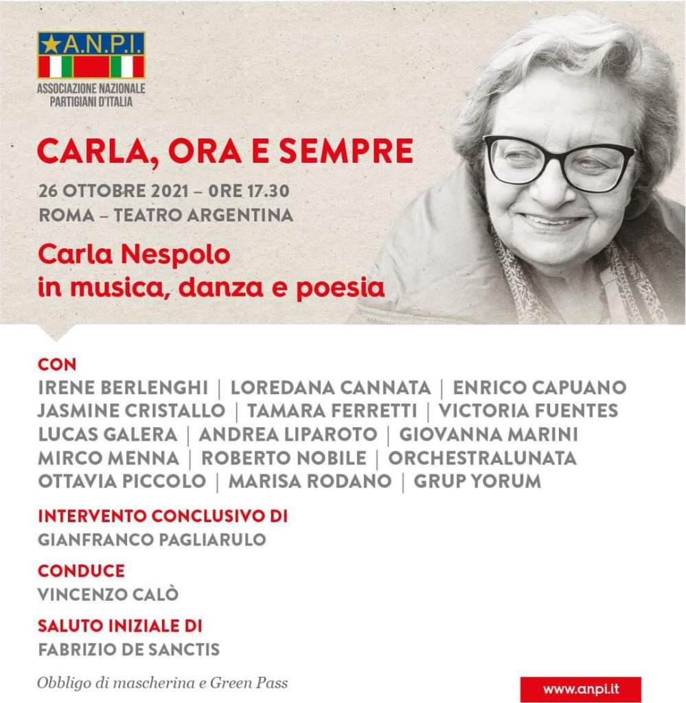 Il 26 ottobre alle ore 17,30 presso il Teatro Argentina di Roma si è tenuto l’evento in ricordo di Carla Nespolo, scomparsa poco più di un anno fa. Alla commemorazione hanno partecipato Cristina Olini e Aladino Lombardi (nella foto qui sotto assieme a Jole Mancini).