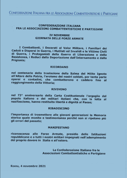 Pubblichiamo e sottoscriviamo il documento condiviso da tutte le Associazioni della Confederazione Italiana fra le Associazioni Combattentistiche e Partigiane
