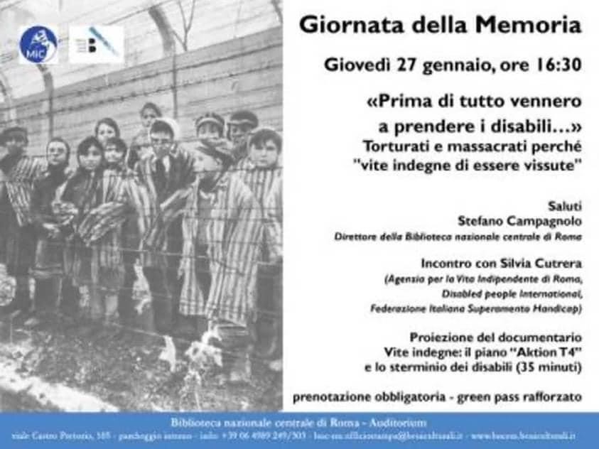 Alla Biblioteca Nazionale Centrale di Roma, giovedì 27 gennaio alle ore 16:30, per la Giornata della Memoria, parteciperà la nostra Vicepresidente Nazionale Silvia Costa. Le sue parole: “Giornata della memoria dedicata alle oltre 300 mila vittime, iniziando dai bambini, disabili o bollati come tali, come “vite indegne di essere vissute” che furono uccisi, a partire dal 1938, negli ospedali psichiatrici tedeschi e austriaci applicando il cosiddetto “piano T4”, ovvero l’eutanasia eugenetica. Furono loro le prime vittime delle perverse tecniche di stermino che poi saranno usate nei campi di concentramento.