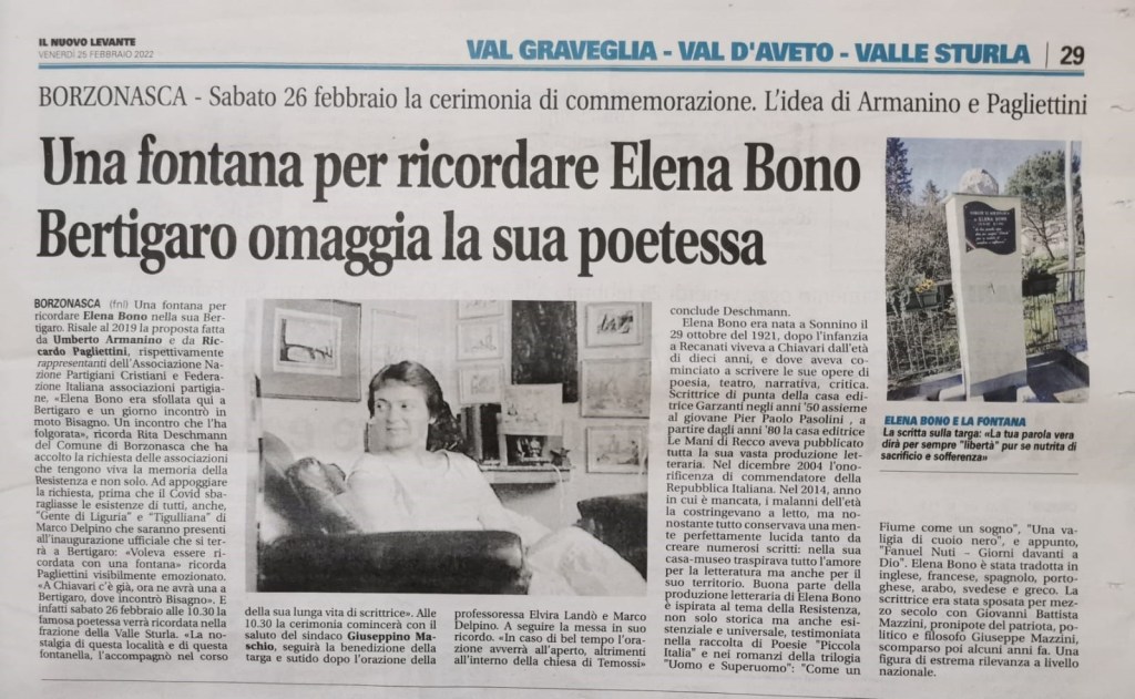 Gli articoli sulla stampa: https://www.teleradiopace.tv/2022/02/24/borzonasca-ricorda-elena-bono-sabato-cerimonia-commemorativa-a-bertigaro/;