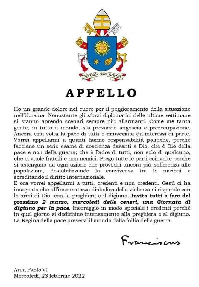 Sin da subito, con tutte le donne e gli uomini di buona volontà ci uniamo alla giornata di digiuno per la pace promossa da papa Francesco per il 2 marzo ed esortiamo tutti gli interlocutori, per primo il Governo russo, ad abbandonare immediatamente il piano del confronto armato e a tornare a quello delle trattative diplomatiche, avendo come unico bene da tutelare la libertà e il benessere dei popoli.