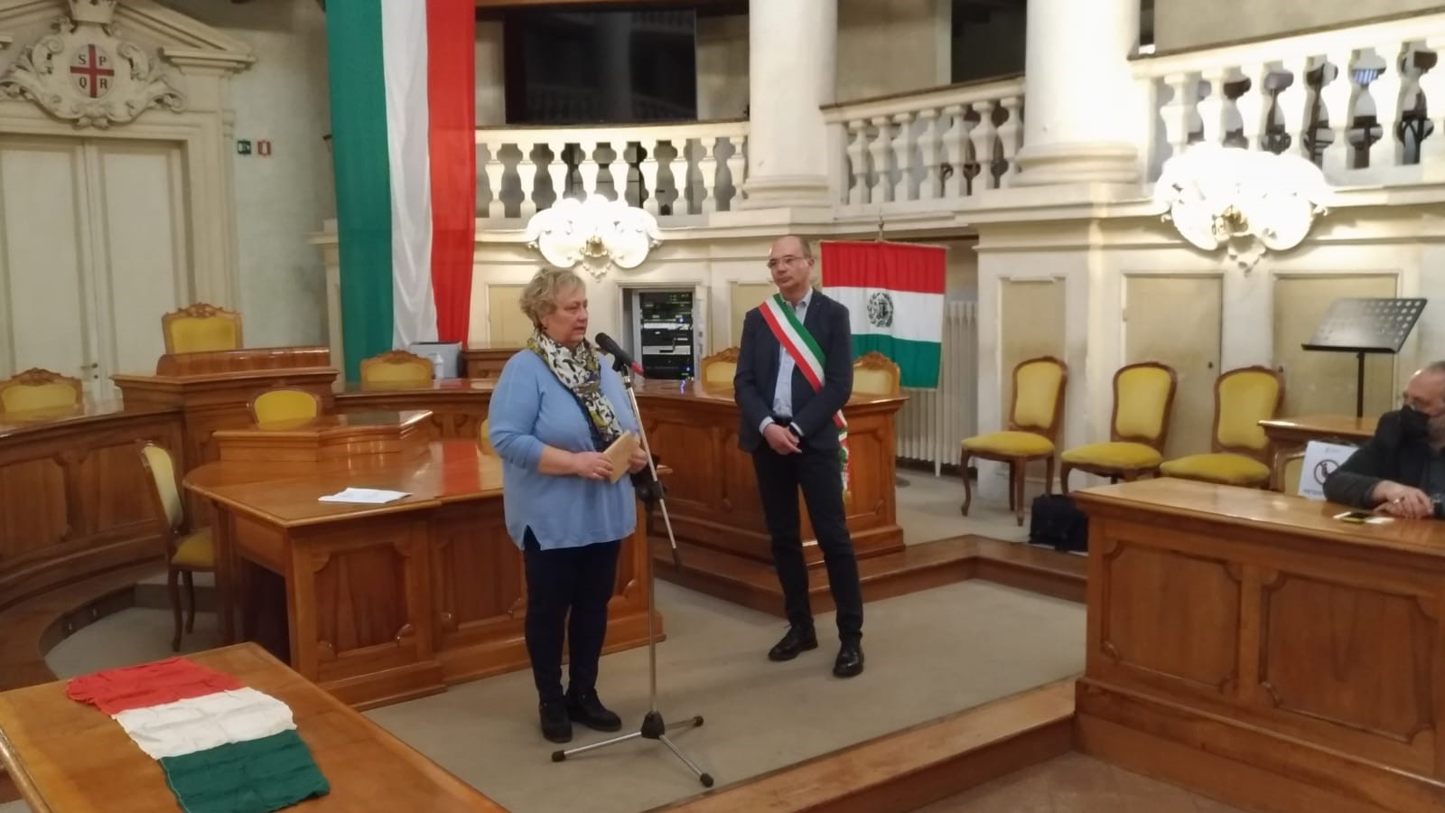“Nello scorso mese di Febbraio è mancata all’età di 96 anni Elda Filiberti, staffetta partigiana cattolica ed esponente di spicco del cattolicesimo democratico di Buccinasco. Elda Filiberti è stata un punto di riferimento importante per tutta la nostra comunità di Buccinasco. Staffetta partigiana, impegnata politicamente ed amministrativamente in Consiglio comunale per molti anni per la Democrazia Cristiana, poi PPI-Margherita ed infine orgogliosamente PD, fedele sempre all’esperienza del cattolicesimo democratico. L’ultima volta da consigliera comunale, ne era fiera, una persona veramente speciale. Coltivò il rapporto coi giovani da vera testimone.” Ha riletto il saluto che Gianni Maiorano (già sindaco di Buccinasco aveva letto al funerale, aggiungendo “mi ha dato l’opportunità di portare la bandiera dell’associazione Partigiani Cristiani durante il corteo del 25 Aprile e ieri di presenziare, sempre con la gloriosa bandiera blu dell’ANPC, l’inaugurazione della Sala Consiliare a Lei intitolata. Stefano Parmesani”.
