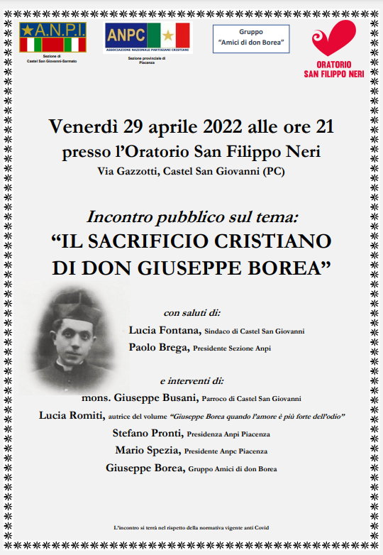 Venerdì 29 aprile 2022 alle ore 21 presso l’Oratorio San Filippo Neri Via Gazzotti, Castel San Giovanni (PC) l’incontro pubblico sul tema: “IL SACRIFICIO CRISTIANO DI DON GIUSEPPE BOREA”