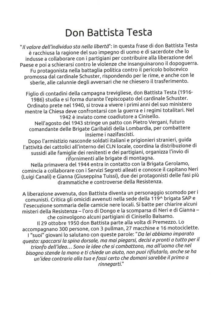 La Libertà è partecipazione, cantava il grande Gaber: sì, perché senza partecipazione si può anche perdere la libertà, senza impegno civile si può facilmente delegare e diventare schiavi di nuove forme di sottile dittatura, magari non imposta con le armi, ma con nuove forme di coercizione. Discernimento, confronto, dialogo: questi sono gli ingredienti che fanno lievitare la torta della Libertà. Ecco allora il Dono Libertà da difendere, come ha fatto don Battista, prima ribellandosi al regime fascista, ma poi anche opponendosi a nuove forme di imposizioni antiliberali. Ringrazio il Sindaco Giacomo Ghilardi e tutta la Giunta che ha patrocinato questa serata, le associazioni che hanno aderito con spirito di collaborazione a questa iniziativa, le autorità presenti, le Cooperative cittadine, l’Anpi di Cinisello Balsamo, ANPC Città Metropolitana di Milano con Luisa Ghidini, che ha appoggiato la ricostituzione della nostra sezione locale, e tutti Voi qui intervenuti, dimostrazione che la voglia di conoscere la nostra storia è ancora forte. Il prossimo 23 Aprile, ricorderemo ancora Don Battista Testa con la posa di una targa commemorativa in p.zza Gramsci, sul portone di Villa Arconati, dove visse dal 1942 al 1950 durante il Suo ministero a Cinisello. Un modo di dimostrare la nostra riconoscenza ad un esempio di fede e di impegno civile, beni di cui abbiamo sempre bisogno”.