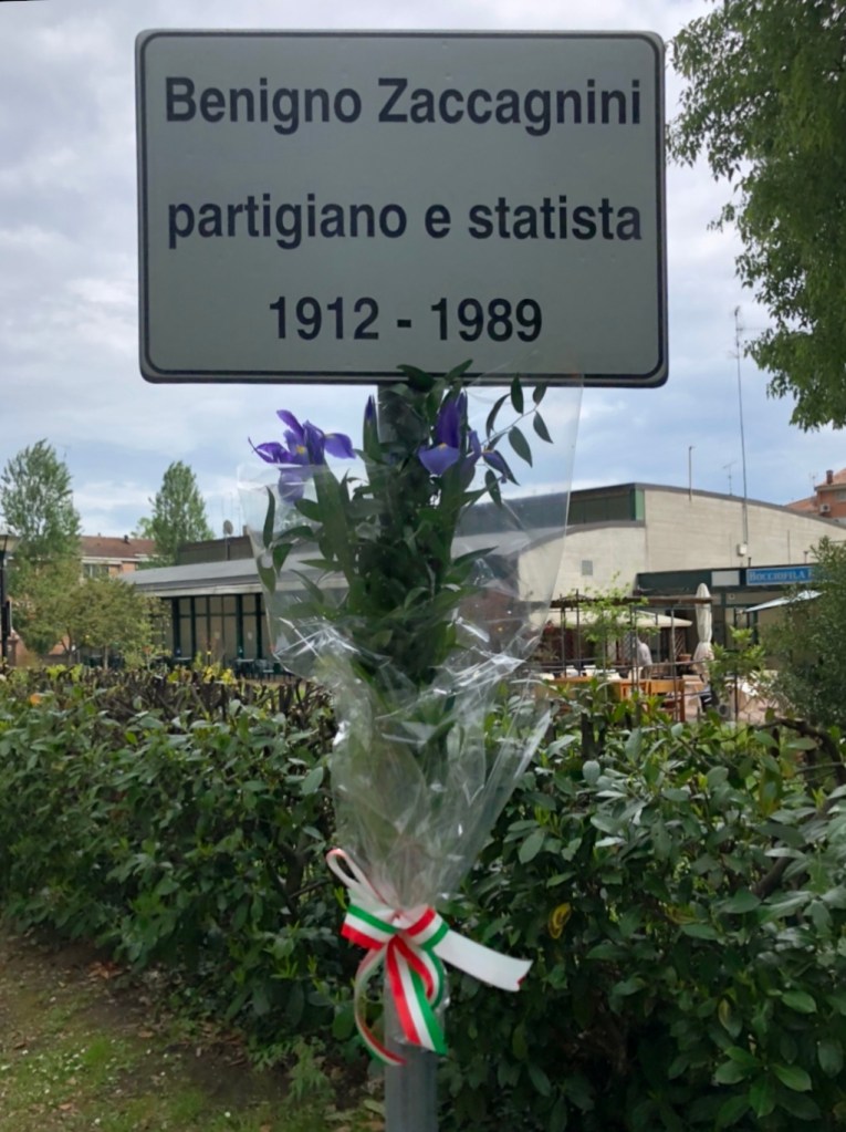 Nel pomeriggio ci siamo radunati al parco pubblico per deporre un omaggio floreale alla targa che ricorda il partigiano e statista Benigno Zaccagnini.