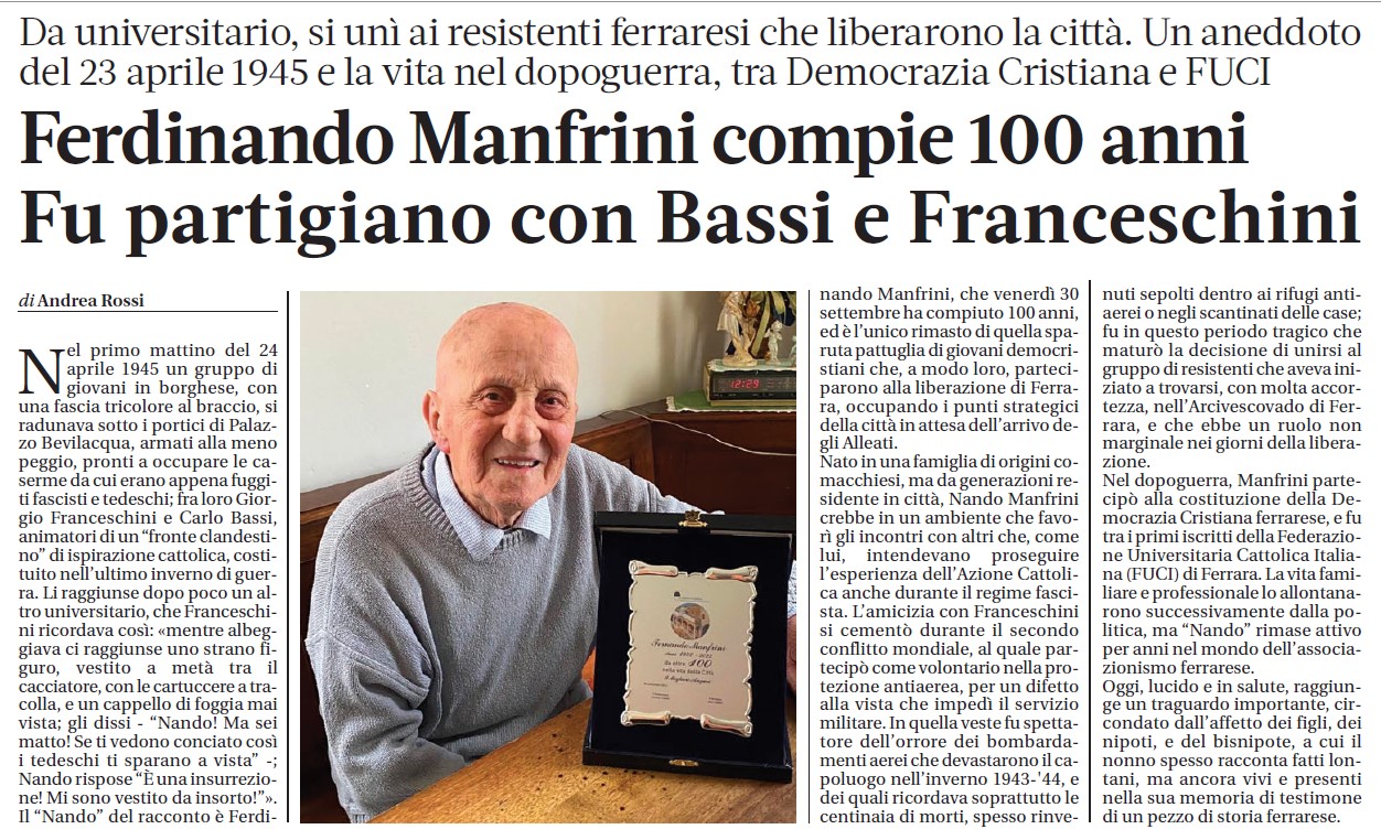 Tutta la Anpc si unisce agli auguri della Sezione di Ferrara per i 100 anni del partigiano Ferdinando Manfrini, sempre grati per il suo valore e la sua testimonianza.