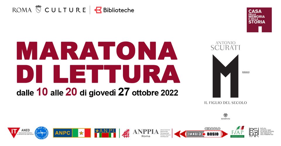 Giovedì 27 ottobre, dalle 10.00 alle 20.00, la Casa della Memoria e della Storia ospita una maratona di lettura di brani tratti da M. Il figlio del secolo di Antonio Scurati, vincitore del Premio Strega 2019, romanzo storico che ricostruisce la nascita del Fascismo tra il 1919 e il ’24. L’evento è organizzato in occasione del centenario della Marcia su Roma fascista del 1922 dalle associazioni residenti della Casa – Associazione nazionale ex deportati, Associazione nazionale ex internati, Associazione Nazionale Partigiani Cristiani, Associazione nazionale partigiani d’Italia, Associazione nazionale perseguitati politici italiani antifascisti, Circolo Gianni Bosio, Federazione italiana associazioni partigiane, Istituto romano per la storia d’Italia dal fascismo alla resistenza – insieme all’Istituzione Biblioteche di Roma Capitale cui appartiene la Casa della Memoria e della Storia, con l’intento di rinnovare l’impegno per la memoria attiva e la verità storica.