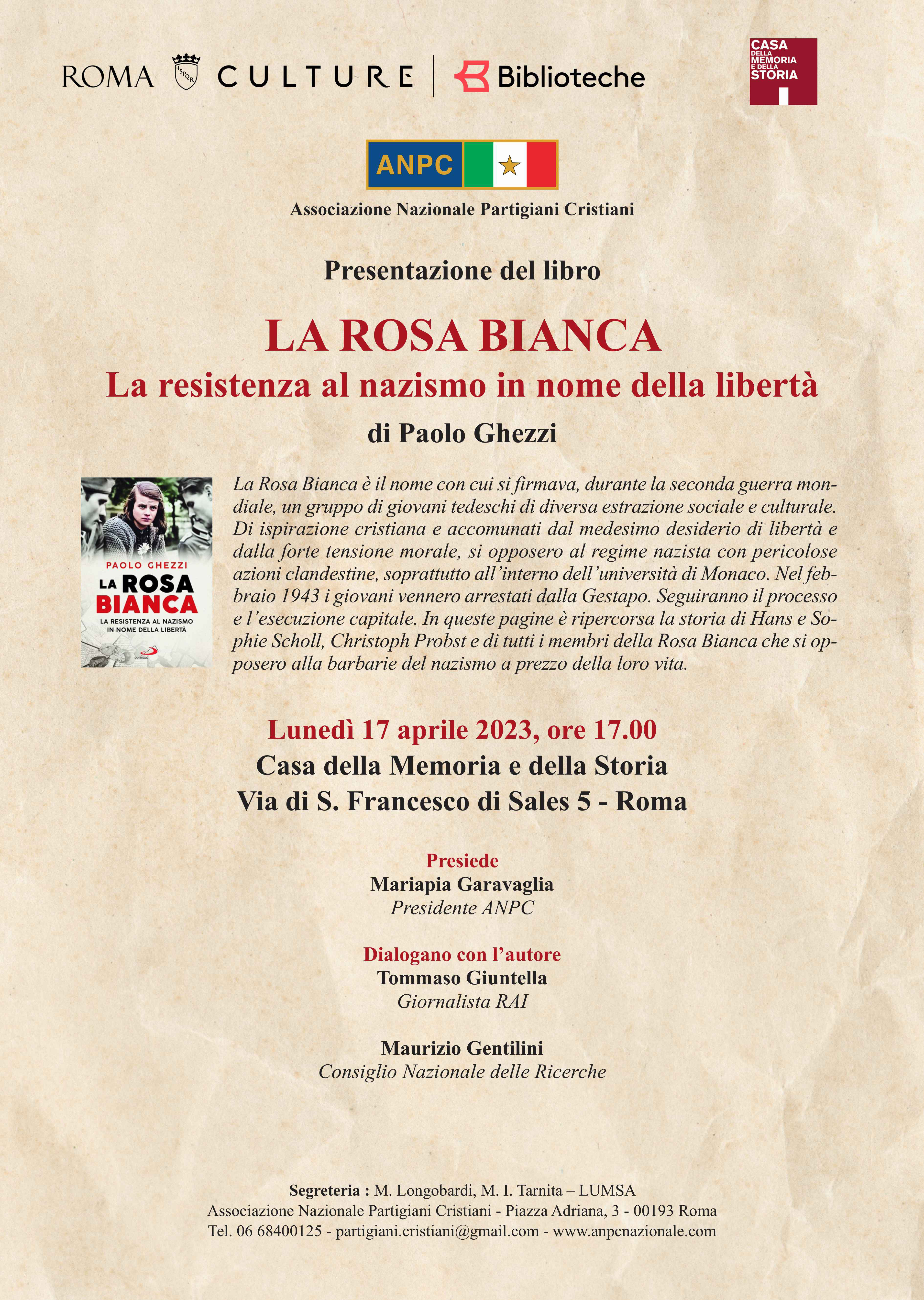 Save the date – 17 Aprile 2023 alle ore 17,00 presso la Casa della Memoria in Roma presentazione del libro di Paolo Ghezzi: “La Rosa Bianca. La resistenza al nazismo in nome della Libertà”.
