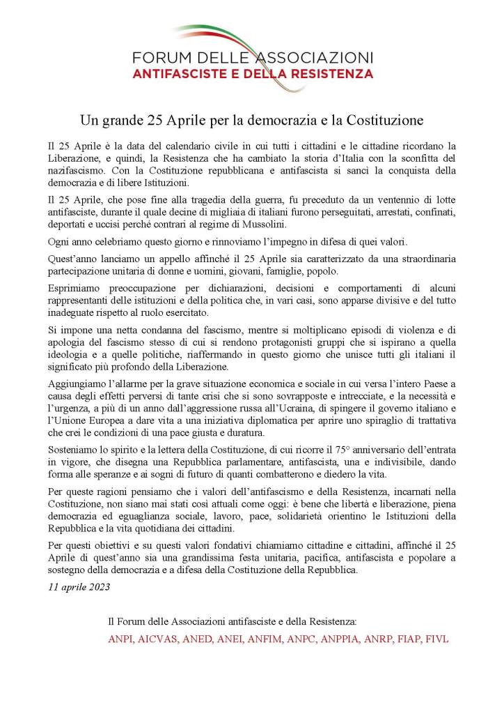 Per questi obiettivi e su questi valori fondativi chiamiamo cittadine e cittadini, affinché il 25 Aprile di quest’anno sia una grandissima festa unitaria, pacifica, antifascista e popolare a sostegno della democrazia e a difesa della Costituzione della Repubblica.