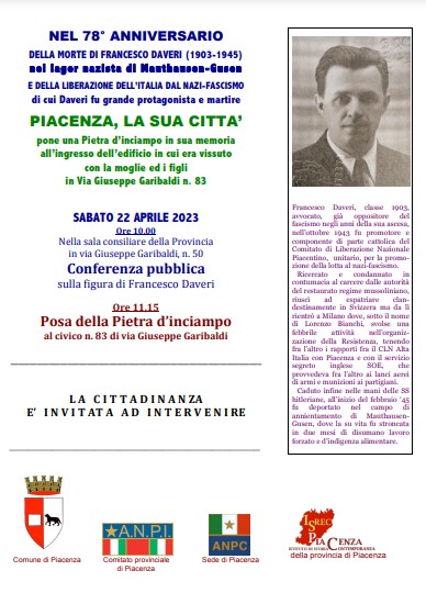 Al proposito segnaliamo la cerimonia della posa della Pietra d’Inciampo in memoria dell’avv. Francesco Daveri, cattolico, leader del CLN piacentino, morto di stenti ad inizio aprile 1945 nel campo di lavoro Gusen II, sottocampo di Mauthausen.