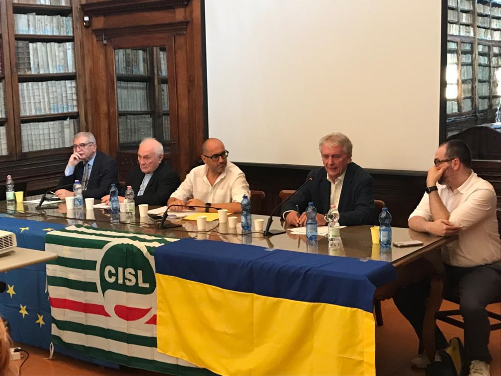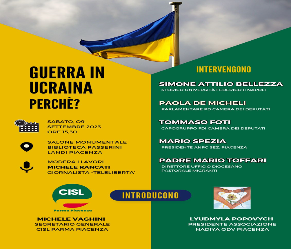 L’incontro, seguito da un folto pubblico, è stato introdotto da Michele Vaghini, segretario generale Cisl Parma Piacenza, e da Lyudmyla Popovych, presidente dell’Associazione “Nadiya” Odv a Piacenza, fondata nei primi giorni di guerra per portare aiuto in Ucraina oltre che per dare assistenza ai profughi nel territorio piacentino, ed ha tratto le conclusioni Andrea Cuccello, segretario nazionale CISL.
