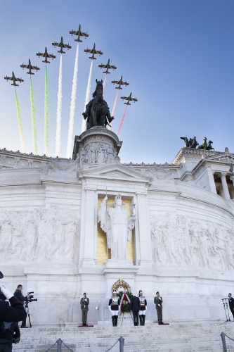 Questa mattina, all’Altare della Patria, l’apertura delle celebrazioni del 4 novembre con l’omaggio del Presidente della Repubblica Sergio Mattarella che, accompagnato dal Ministro della Difesa e dalle più Alte Cariche istituzionali, ha deposto una corona d’alloro al Sacello del Milite Ignoto. Momento solenne, sottolineato dal tradizionale passaggio delle Frecce Tricolori.