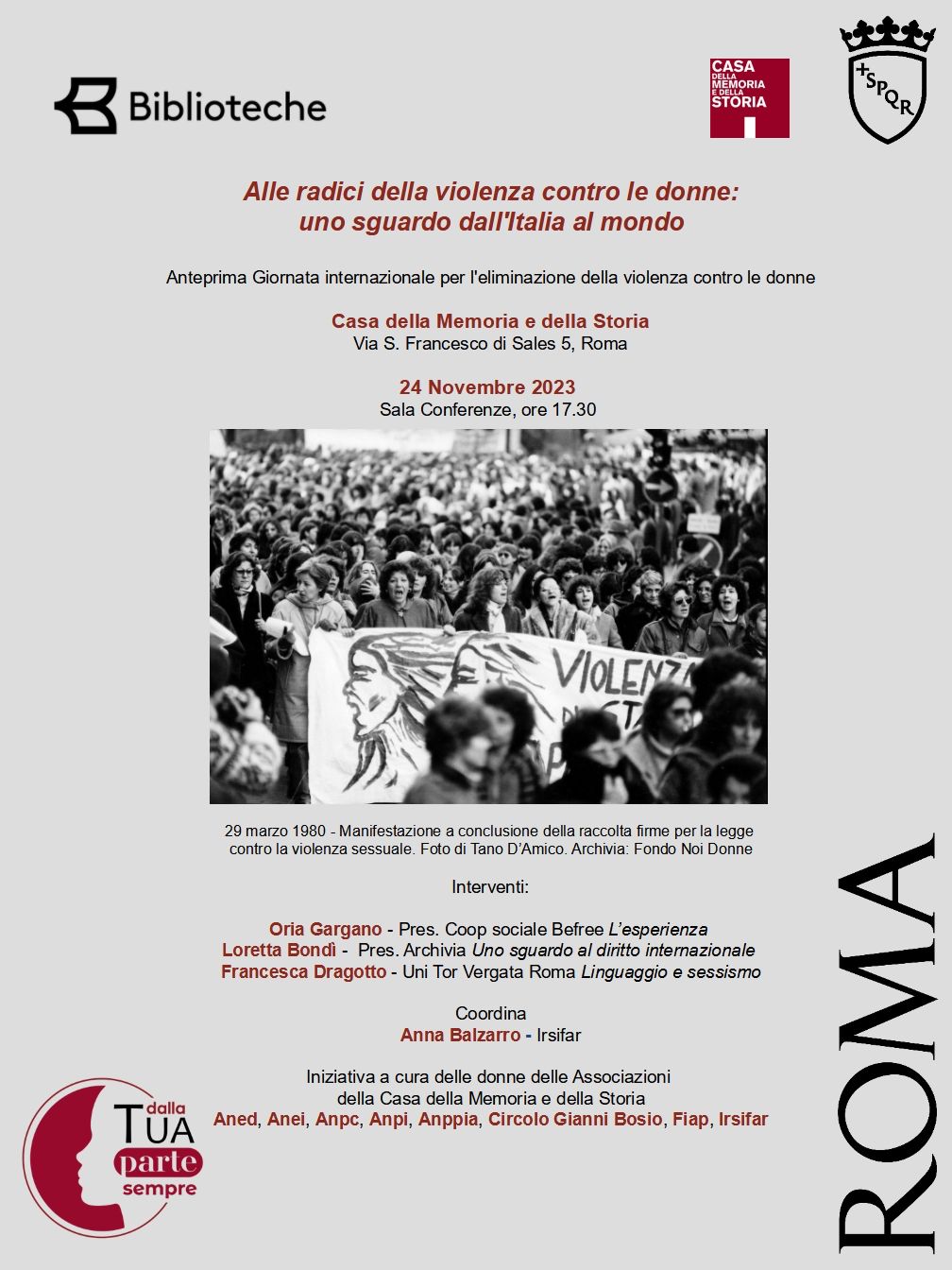 Anteprima Giornata Internazionale per l’eliminazione della violenza contro le donne. Appuntamento alla Casa della Memoria e della Storia a Roma il 24 Novembre 2023 alle ore 17,30.