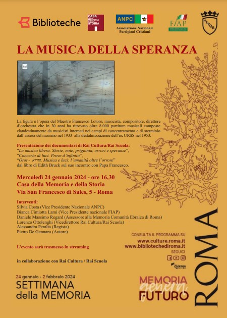 Il 24 gennaio 2024 presso la casa della Memoria e della Storia in Roma si è svolto con grande partecipazione ed apprezzamento l’evento di apertura della Settimana della Memoria a cura di ANPC e FIAP e promosso da tutte le associazioni della Casa della Memoria. Sono intervenuti: Silvia Costa (vicepresidente nazionale ANPC), Bianca Cimiotta Lami (vicepresidente nazionale FIAP), Daniele Massimo Regard (assessore alla Memoria Comunità Ebraica di Roma), Lorenzo Ottolenghi (vicedirettore Rai Cultura/Rai Scuola), Alessandra Peralta (regista), Pietro De Gennaro (autore).
