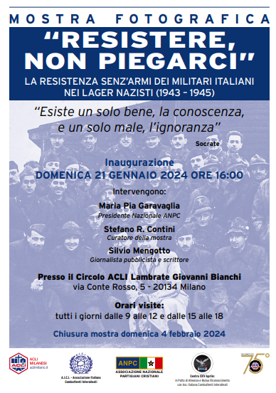 In collaborazione con le Associazioni A.I.C.I. (Associazione Italiana Combattenti Interalleati), Centro XXV aprile, le Acli Milanesi e in particolare il Circolo Acli Giovanni Bianchi di Lambrate, ci sarà l’inaugurazione a Milano della mostra sugli IMI (Internati Militari Italiani), in occasione della ricorrenza degli 80 anni da quel 8 settembre 1943. “RESISTERE, NON PIEGARCI” – questo il titolo che abbiamo dato alla mostra, che vuole essere un tributo a quei 650.000 giovani che l’8 settembre 1943 rifiutarono di aderire alla Repubblica di Salò e che per questo furono deportati nei lager tedeschi. Domenica 21 gennaio 2024, alle ore 16:00 presso il Circolo ACLI Giovanni Bianchi di Lambrate, si terrà la presentazione della mostra a cura di Stefano Contini (Delegato AICI di Acqui Terme) e Mariapia Garavaglia (Presidente Nazionale Anpc).