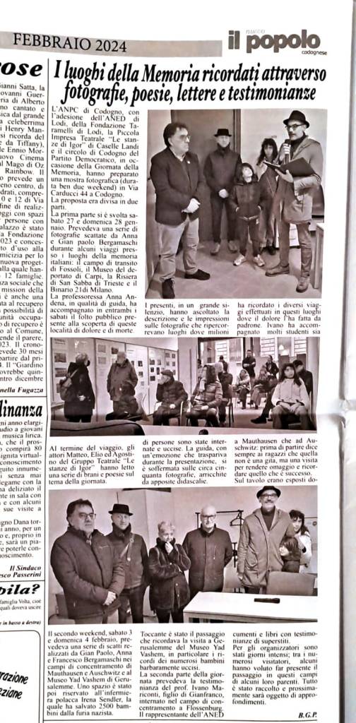 L’Anpc di Codogno con l’adesione dell’Aned di Lodi, della Fondazione Taramelli di Lodi, la Piccola Impresa Teatrale “Le stanze di Igor” di Caselle Landi ed il Circolo di Codogno del PD, in occasione della Giornata della Memoria, hanno preparato una mostra fotografica (durata ben due weekend) in Via Carducci 44 a Codogno. La proposta era divisa in due parti.