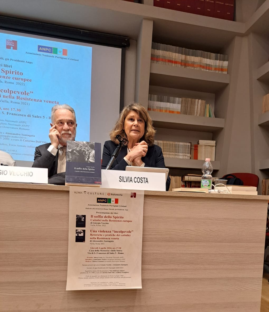 Presentazione dei due libri sui Cattolici nella resistenza in Europa di Giorgio Vecchio e la resistenza cattolica in Veneto di Alessandro Santagata. La sala della Casa della Memoria era praticamente piena con presenze qualificate e partecipi. Con Gianfranco Noferi e Silvia Costa, gli autori, Chiara Graziani e la vicepresidente Cristina Olini assieme a Luisa Ghidini e Maurizio Gentilini. È’ venuta con il marito Daniela Matulli, che ha molto ringraziato per avere dedicato al padre, il nostro indimenticabile Beppe, l’iniziativa.