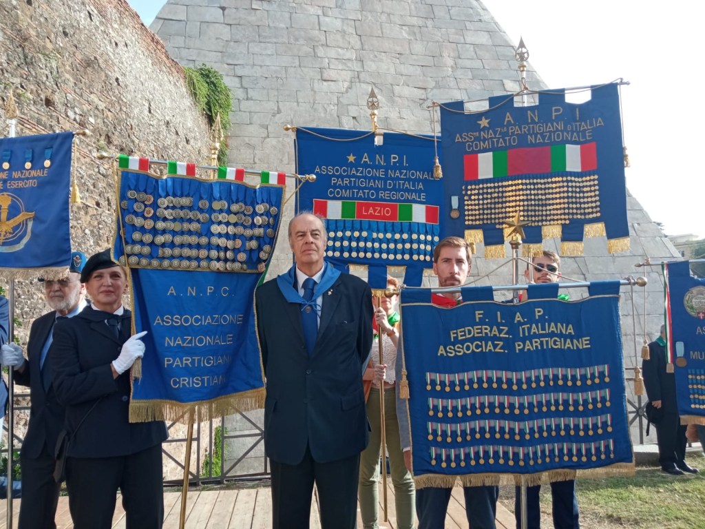 A Roma oggi due corone di fiori deposte questa mattina dal Capo dello Stato Sergio Mattarella in omaggio ai militari e ai civili morti nel 1943 per la difesa di Roma, a Porta San Paolo e al Parco della resistenza dell’8 settembre. Al suo fianco il sindaco, il presidente della Regione e il ministro della Difesa, Guido Crosetto. Per l’Anpc erano presenti il Consigliere Nazionale Aladino Lombardi e l’Alfiere Lucia Scagnoli con il nostro medagliere.