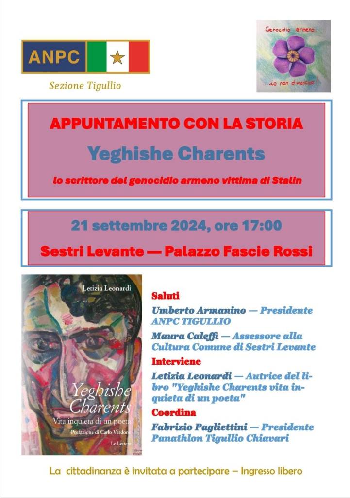 A Sestri Levante il 21 setttembre alle ore 17,00 presso il Palazzo Fascie Rossi “Appuntamento con la storia”: “Yeghishe Charents. Lo scrittore del genocidio armeno vittima di Stalin” . Qui sopra la locandina con il programma dell’evento. La cittadinanza è invitata a partecipare. Ingresso libero.