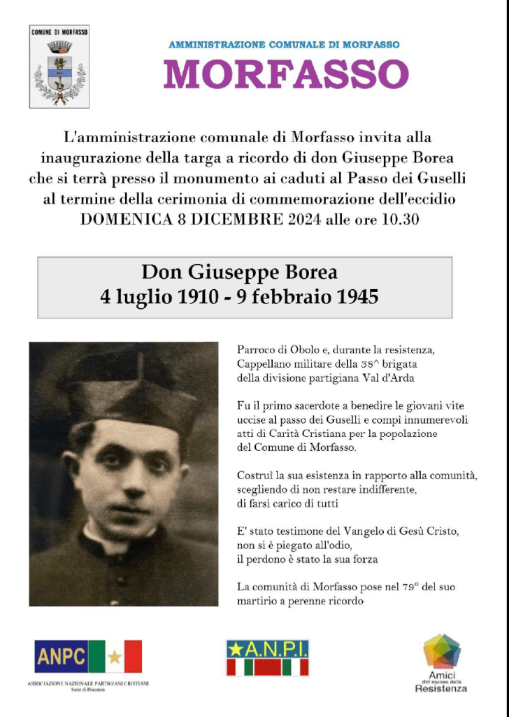 La manifestazione è stata poi annullata in previsione dell’abbondante nevicata nella giornata di domenica 8 dicembre, ma una delegazione piacentina dell’Associazione Nazionale Partigiani Cristiani non ha voluto rinunciare alla commemorazione di quegli eventi lontani, recandosi ai piedi del sacrario dove è stata collocata una targa in memoria di Don Giuseppe Borea, sacerdote originario del paese poco lontano di Obolo, anche lui ucciso dai nazisti e per il quale ANPC ha presentato al Vescovo di Piacenza la richiesta di avvio del processo diocesano di canonizzazione.