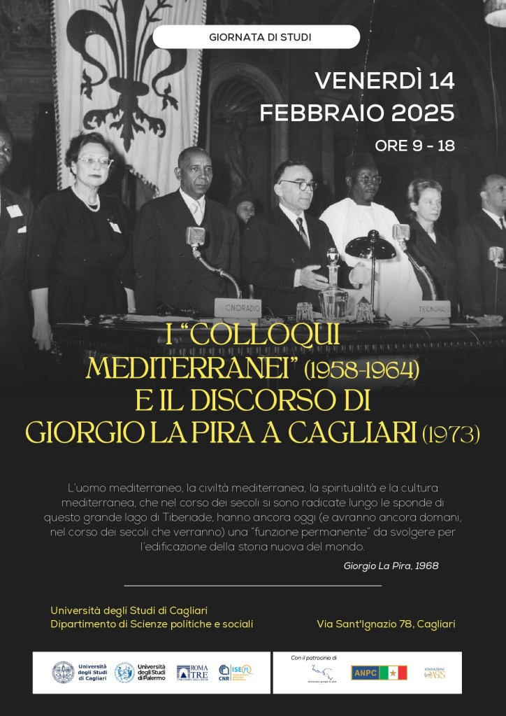 Il programma e locandina della Giornata di studi “I Colloqui Mediterranei (1958-1964) e il discorso di Giorgio La Pira a Cagliari (1973)”. con il patrocinio di ANPC del 14 febbraio 2025, ore 09.00 – 18.00. Università degli Studi di Cagliari – Dip. di Scienze politiche e sociali. Via Sant’Ignazio 78, Cagliari.