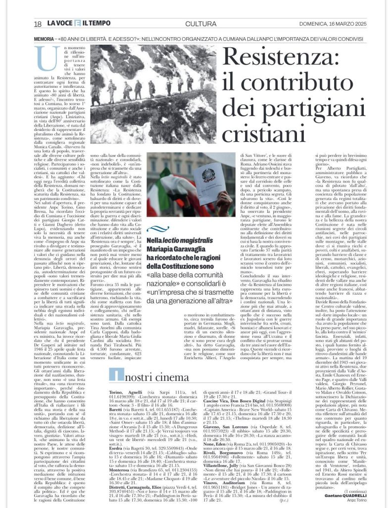 “Un momento di riflessione sull’importanza che tiene vivi i valori che hanno animato la Resistenza, per contratsare ogni forma di autoritarismo e intolleranza. E’ questo lo spirito che ha animato “80 anni di libertà. E adesso?”, l’incontro tenutosi a Cumiana lo scorso 1° marzo, organizzato dall’Associazione Nazionale Partigiani Cristiani. L’iniziativa in vista dell’80° anniversario della Liberazione, “è nata dal desiderio di rappresentare il pluralismo che animò la Resistenza” come sottolineato dalla Consigliera regionale Monica Canalis. (…) Nella lectio magistralis Mariapia Garavaglia ha ricordato che le ragioni della Costituzione sono “alla base della comunità nazionale” e consolidarli è “un’impresa che si trasmette da una generazione all’altra”.