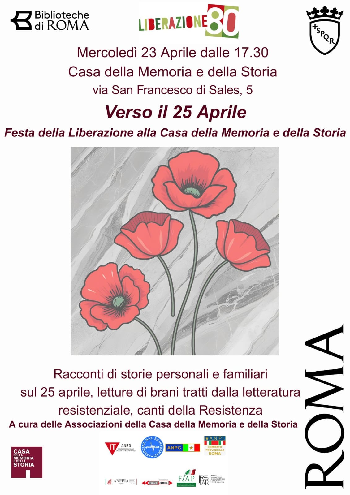 Mercoledì 23 aprile 2025 alle ore 17,30 presso la Casa della Memoria e della Storia in Via San Francesco di Sales, 5 a Roma: “Verso il 25 Aprile. Festa della Liberazione alla Casa della memoria e della Storia a Roma”. Racconti di storie personali e familiari sul 25 aprile, letture di brani tratti dalla letteratura resistenziale, canti della Resistenza.