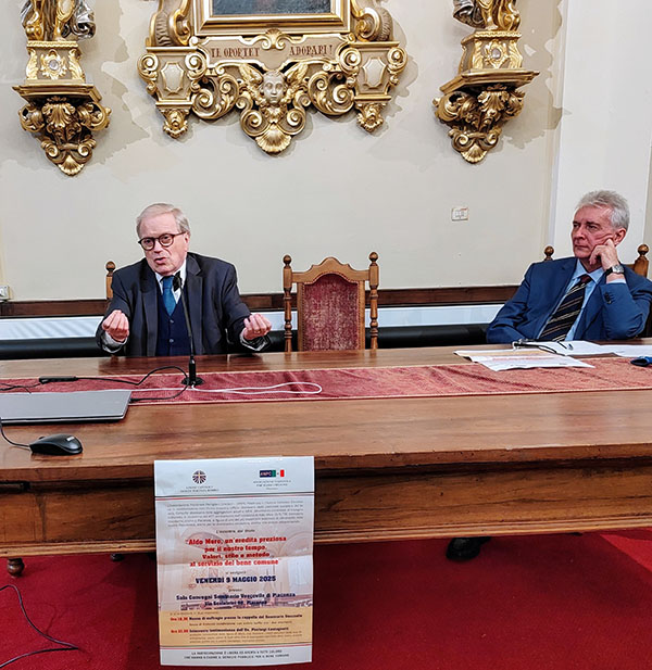 Si è quindi tenuto l’incontro aperto da Mario Spezia, presidente Associazione Naziponale Partigiani Cristiani di Piacenza, che ha ricordato i tratti salienti della vita politica dell’on. Moro e ha presentato il relatore on. Pierluigi Castagnetti: deputato alla Camera per 5 legislature dal 1987 al 1994 e dal 2001 al 2013, durante i quali ha ricoperto vari incarichi parlamentari, oltre che europarlamentare dal 1994 al 1999. È stato esponente della Democrazia Cristiana, l’ultimo segretario del Partito Popolare Italiano, capogruppo de La Margherita ed esponente del Partito Democratico, è stato presidente della Fondazione Fossoli (ex campo di concentramento di Fossoli, Carpi). Fa parte del direttivo della Casa della Storia europea di Bruxelles.