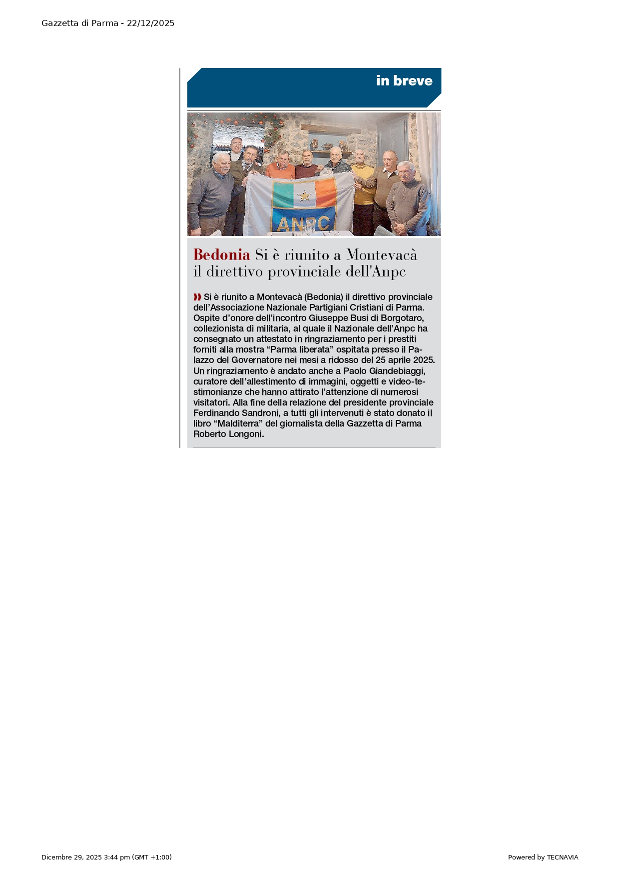 Si è riunito a Montevacà (Bedonia) il direttivo provinciale dell’ANPC di Parma. Qui l’articolo pubblicato sulla Gazzetta di Parma del 22/12/2025.