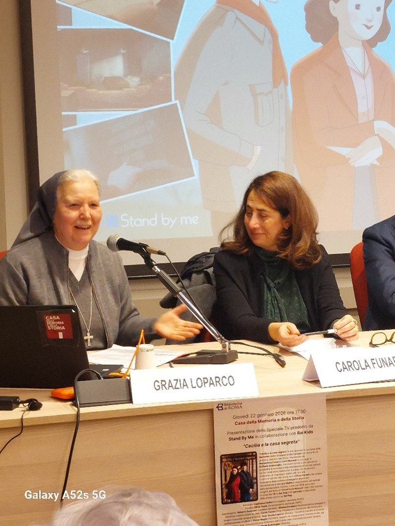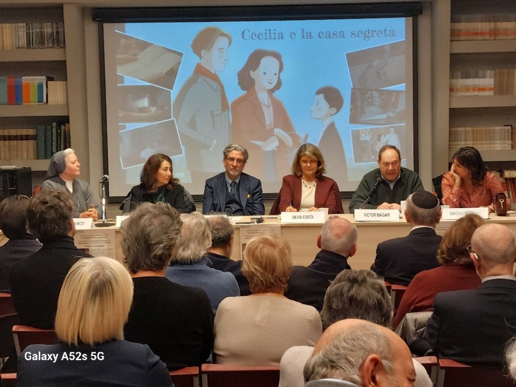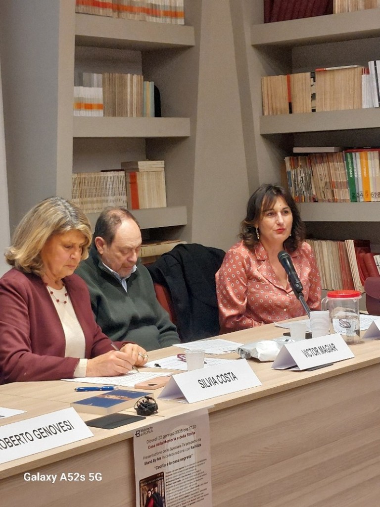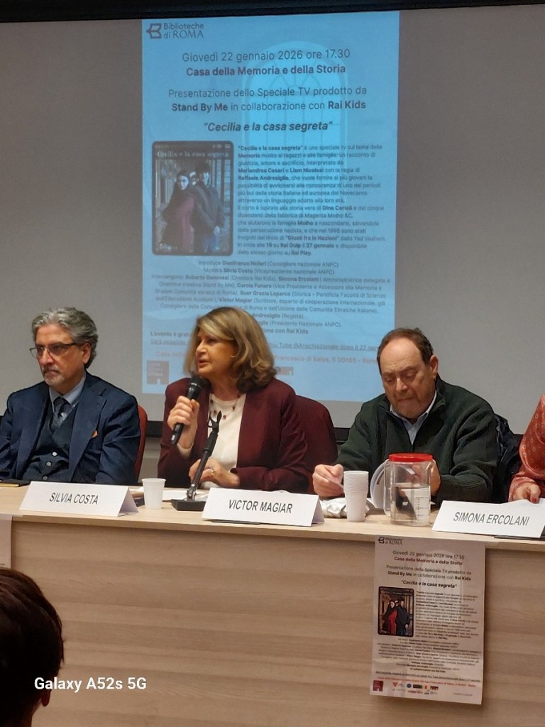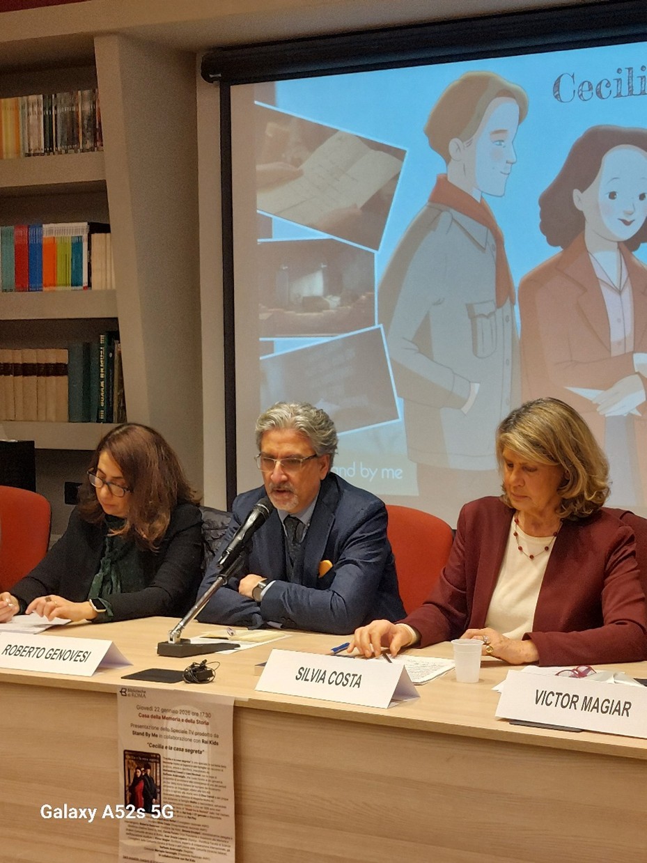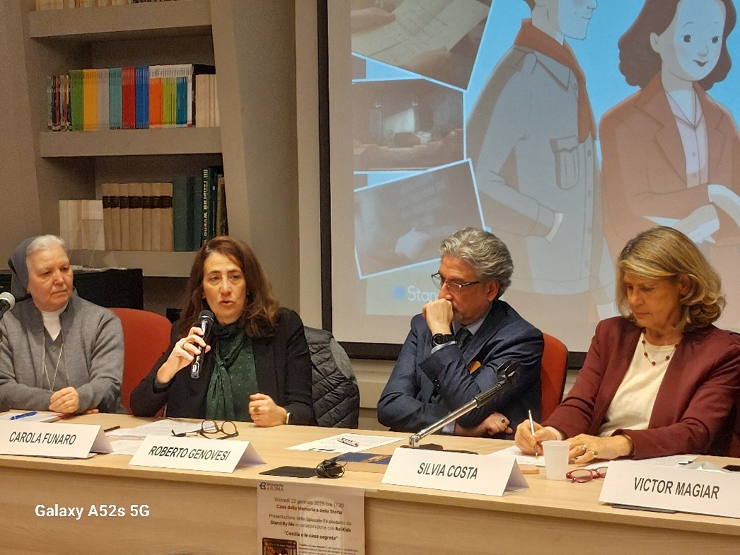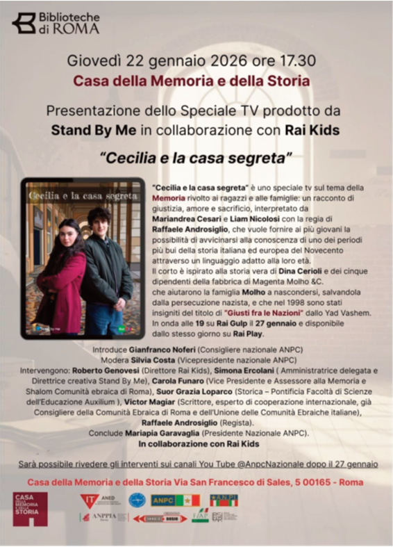 In occasione del Giorno della Memoria 2026 l’ANPC Associazione Nazionale Partigiani Cristiani ha promosso un incontro sul tema della Shoah spiegata ai bambini e ragazzi. È stato presentato in anteprima lo Speciale TV “Cecilia e la casa segreta” prodotto da Stand By Me in collaborazione con Rai Kids, in onda alle 19 su Rai Gulp il 27 gennaio e che sarà disponibile dallo stesso giorno su Rai Play. L’incontro si è tenuto presso la Casa della memoria e della storia Roma, Giovedì 22 gennaio alle ore 17,30. Dopo i saluti di Paolo Ruffini, direttore della Casa della Memoria e della Storia di Roma, e l’introduzione di Gianfranco Noferi, Segretario Consigliere nazionale ANPC, ha presentato gli ospiti e moderato l’incontro Silvia Costa (Vicepresidente nazionale ANPC). Sono intervenuti Roberto Genovesi (Direttore Rai Kids), Simona Ercolani (Amministratrice delegata e Direttrice creativa Stand By Me), Carola Funaro (Vice Presidente e Assessore alla Memoria e Shalom Comunità ebraica di Roma), Suor Grazia Loparco (Storica – Pontificia Facoltà di Scienze dell’Educazione Auxilium ), Victor Magiar (Scrittore, esperto di cooperazione internazionale, già Consigliere della Comunità ebraica di Roma e dell’Unione delle Comunità ebraiche italiane), Raffaele Androsiglio (Regista). Ha concluso Mariapia Garavaglia (Presidente Nazionale ANPC).
