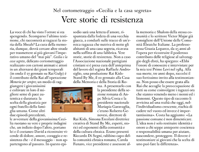 Il corto è ispirato alla storia vera della famiglia Molho, proprietaria di una piccola azienda di Magenta, in Lombardia. A seguito dell’ordinanza Buffarini Guidi del novembre 1943, che aveva disposto l’arresto e la deportazione di tutti gli ebrei nella RSI, i Molho avevano cercato rifugio in una cascina isolata in campagna, ma con l’intensificarsi dei controlli furono costretti a rientrare a Magenta, dove alcuni fidati collaboratori della loro azienda decisero di aiutarli. Rischiando la vita, questi dipendenti costruirono una “casa segreta”, una stanza murata all’interno dello stabile della fabbrica Molho & C., permettendo alla famiglia di restare nascosta per circa un anno e mezzo. In un contesto in cui il Giorno della Memoria rischia spesso di scivolare nella ritualità, Cecilia e la casa segreta dimostra che è ancora possibile parlare di Shoah ai più giovani con linguaggi nuovi, senza perdere rigore storico né forza etica. Un prodotto pensato per la televisione educativa, ma che merita attenzione anche da parte di un pubblico adulto. Tra il pubblico che ha assistito all’anteprima e agli interventi che sono seguiti, è da segnalare la presenta del Sen. Graziano Del Rio, che ha portato il suo saluto, del Rabbino capo della Comunità Ebraica di Roma Riccardo Di Segni e del Consigliere di amministrazione della Rai Roberto Natale.