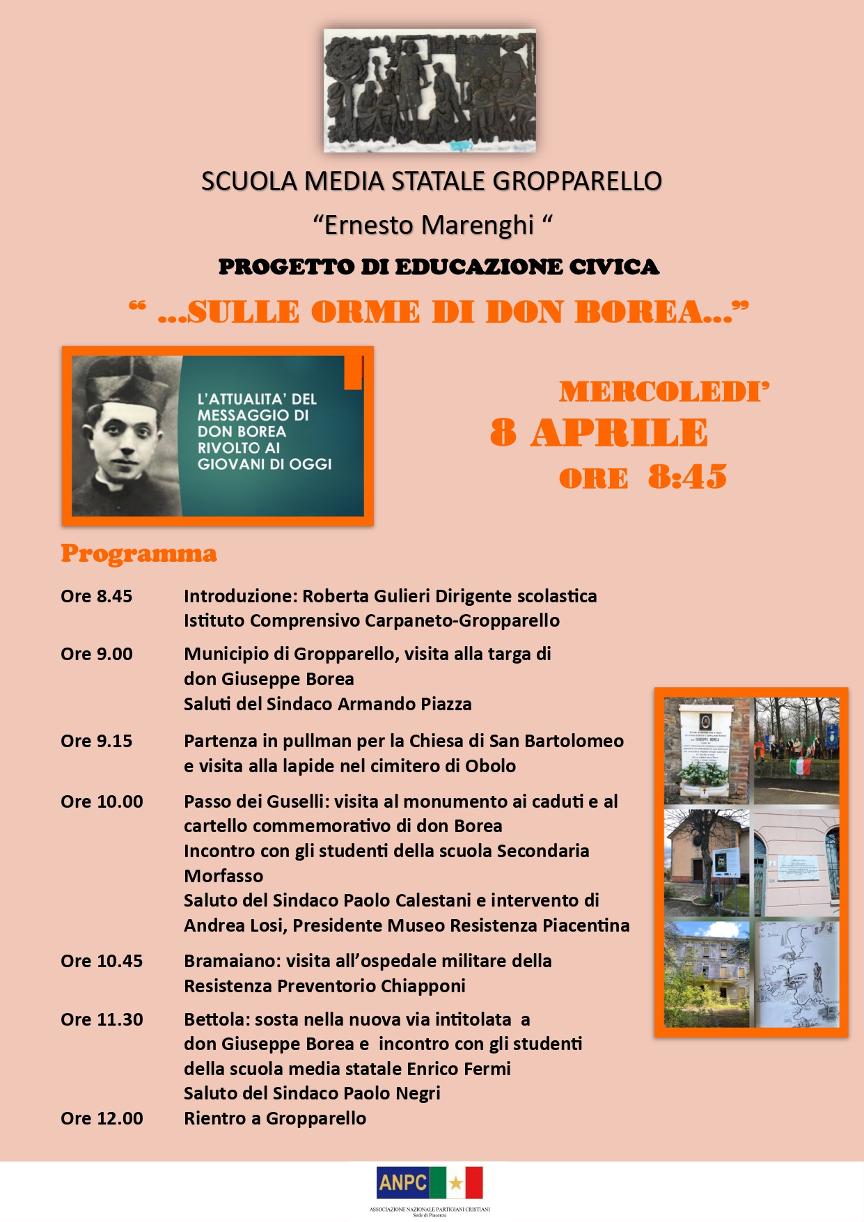 Proseguendo le iniziative nelle scuole per far conoscere i cattolici che hanno portato il proprio contributo alla costruzione del nostro Paese, anche a costo della vita, il prossimo 8 aprile 2026 si terranno una serie di incontri a cui prenderanno parte gli alunni dell’Istituto Comprensivo Carpaneto-Gropparello nell’ambito del PROGETTO DI EDUCAZIONE CIVICA dal titolo:“ …SULLE ORME DI DON BOREA…” (don Giuseppe Borea, uno dei 6 sacerdoti piacentini uccisi durante la lotta di liberazione e per il quale ANPC Piacenza ha chiesto l’avvio del processo diocesano di beatificazione).