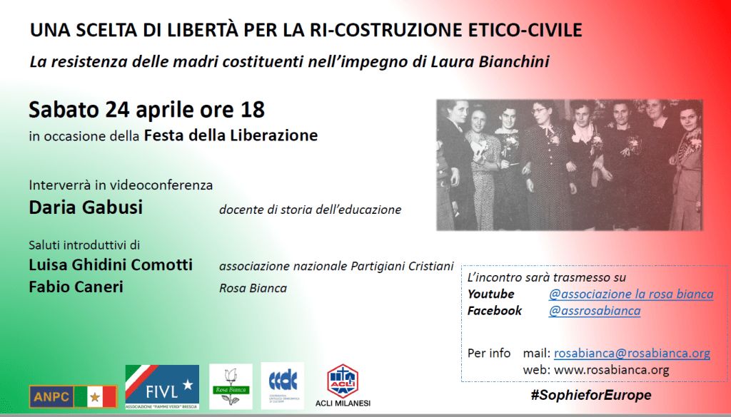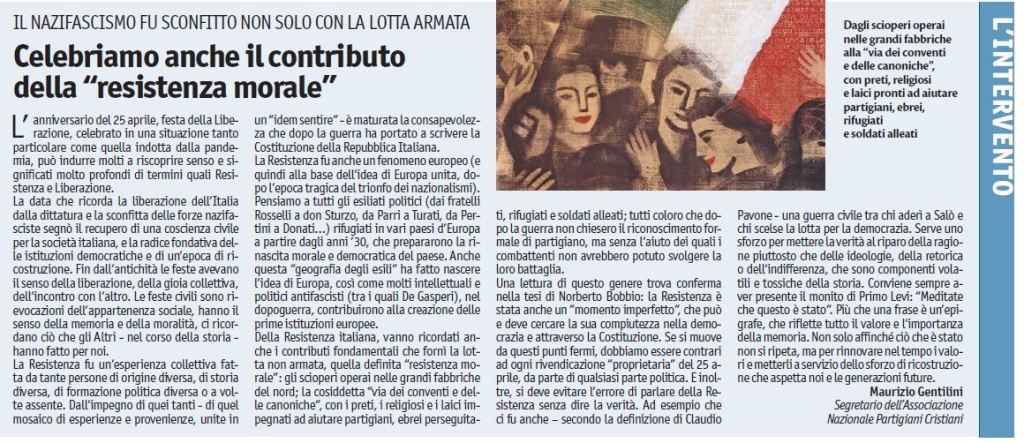 I concetti di Resistenza e Liberazione non sono confinati in un tempo storico. Rappresentano la radice di un continuo agire a servizio della dignità di ogni persona, realizzata con l’esercizio effettivo dei diritti al lavoro, alla salute, alla formazione, alla cultura. Senza il loro valore generativo c’è solo torpore della iniziativa individuale e sociale, la negazione di quanto la Costituzione chiede: “Ogni cittadino ha il dovere di svolgere, secondo le proprie possibilità e la propria scelta, una attività o una funzione che concorra al progresso materiale o spirituale della società” ( art. 4 Cost.). Perciò evviva il 25 aprile! Viva la Repubblica democratica italiana!”.