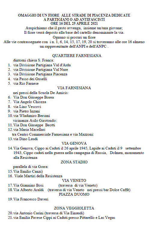 “Anche quest’anno la Festa della Liberazione del 25 aprile è condizionata dagli obblighi di prevenzione imposti dalla pandemia.