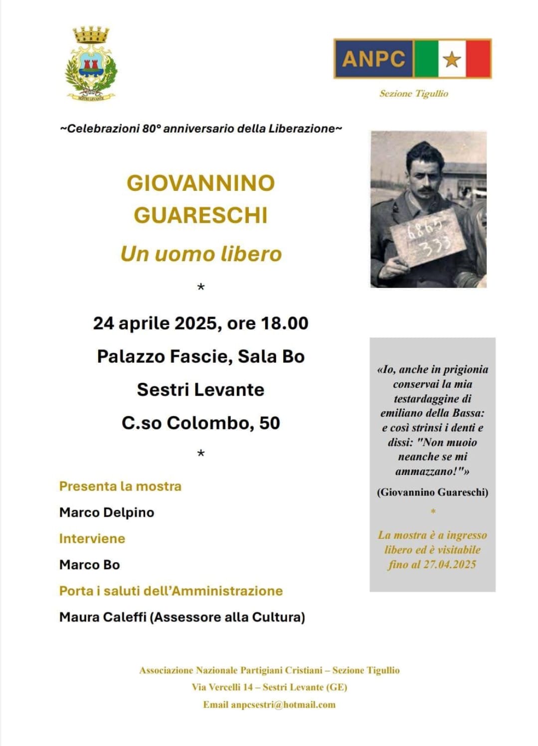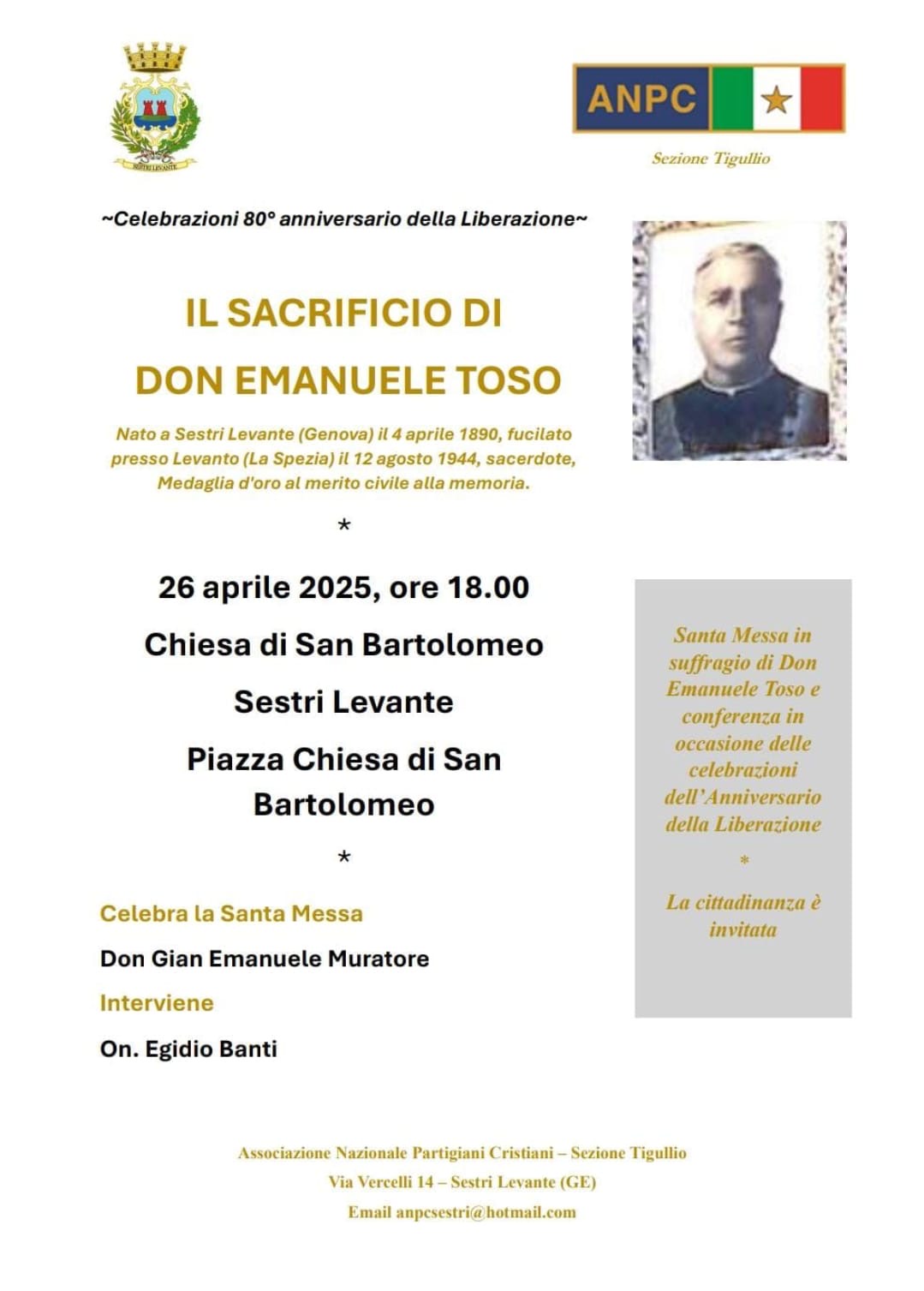 Dopo un breve riassunto di quanto avvenuto il 17 aprile del 1944, mettendo in evidenza il contributo alla salvezza di molti cittadini da parte del parroco don Gioacchino Rey, ha quindi sottolineato la presenza dei Partigiani Cristiani nella lotta di liberazione e la fondazione dell’Anpc da parte di Enrico Mattei.