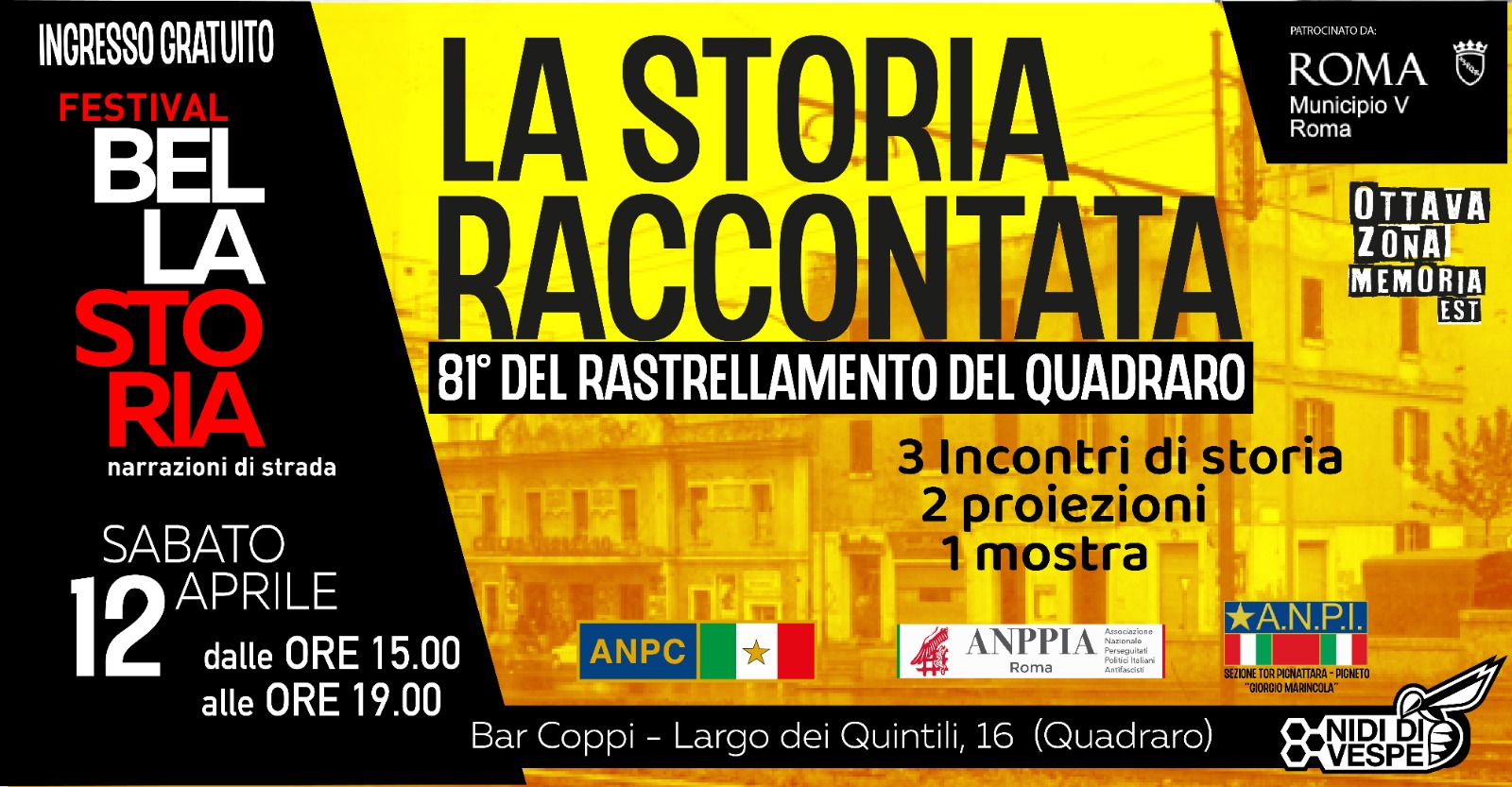 Bella Storia – Narrazioni di Strada in collaborazione con sezione ANPI Giorgio Marincola (Pigneto – Tor Pignattara) nell’ambito del Festival Nidi di Vespe – La primavera della Resistenza romana (https://fb.me/e/4K2kPXqek)