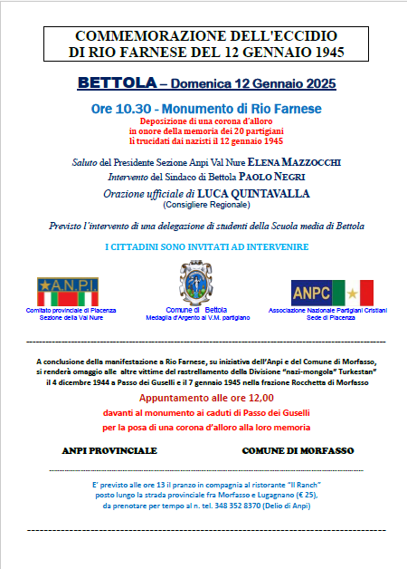 In occasione dell’80° anniversario dell’eccidio, il Comune di Bettola in collaborazione con ANPI Piacenza e ANPC Piacenza. Domenica 12 Gennaio 2025 alle ore 10.30, presso il monumento eretto proprio in località Rio Farnese in Comune di Bettola (Pc), organizzano l’annuale commemorazione, con il programma di cui alla locandina allegata.