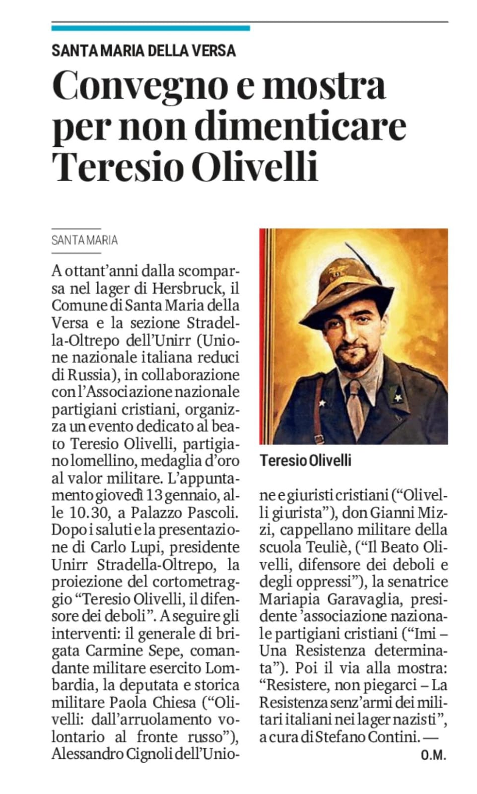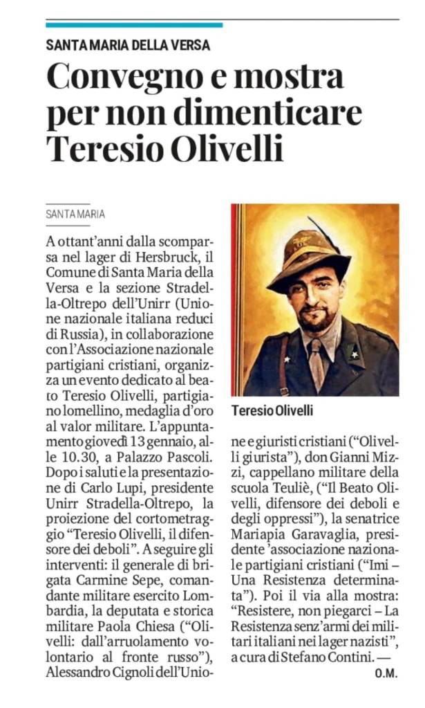 Il Convegno e la mostra “Per non dimenticare Teresio Olivelli” tenutasi nel Comune di Santa Maria della Versa il 13 gennaio 2025 alle ore 10,30 presso Palazzo Pascoli, ha riscosso un grande successo e ha registrato una grande partecipazione. L’Amministrazione Comunale di Santa Maria della Versa ha pubblicato il seguente messaggio con una bella galleria fotografica su questo evento promosso dall’Anpc a 80 anni dalla scomparsa del Beato Olivelli, partigiano lomellino, Medaglia d’Oro al Valor Militare: “L’Amministrazione Comunale di Santa Maria della Versa desidera esprimere il più sincero ringraziamento a tutti coloro che hanno partecipato alla conferenza tenutosi questa mattina presso Palazzo Pascoli, dedicata alla figura del Beato Teresio Olivelli. Un momento di grande valore, che ci ha permesso di riflettere sulla straordinaria vita di un giovane artigliere alpino che, guidato dall’amore per Dio, si è speso fino in fondo per il prossimo, distinguendosi per il coraggio e l’altruismo verso i più deboli. Un sentito grazie ai relatori che, con passione e competenza, hanno raccontato le tappe fondamentali della vita di Olivelli, agli studenti della Scuola di Santa Maria della Versa e ai cadetti della Scuola Militare Teulié per la loro partecipazione. Un ringraziamento speciale va a UNIRR Stradella Oltrepò (Unione Nazionale Italiana Reduci di Russia) e al suo Presidente Carlo Lupi per la collaborazione e il prezioso contributo, nonché ad ANPC (Associazione Nazionale Partigiani Cristiani) per la mostra fotografica “Resistere, non piegarci”, che rimarrà esposta fino a domenica 19 gennaio.