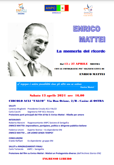 Pubblichiamo la Locandina per la prossima mostra su Enrico Mattei la cui apertura è prevista per sabato 13 Aprile presso il circolo ACLI Falco di Casine di Ostra. La mostra rimarrà aperta fino al 27 Aprile 2024 e sarà accessibile agli interessati tutti i giorni a partire dalle ore 13,00 fino alle 23,00 circa.