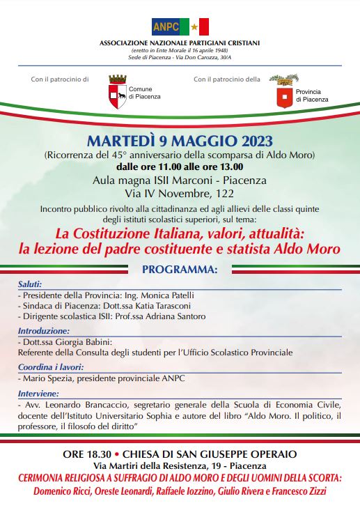L’incontro, aperto alla cittadinanza, organizzato in collaborazione con la referente della Consulta degli Studenti presso l’Ufficio Scolastico Provinciale e con il patrocinio del Comune e della Provincia, dal titolo: “La Costituzione Italiana, valori, attualità: la lezione del padre costituente e statista Aldo Moro” si tiene martedì 9 maggio alle ore 11.00 in città presso l’aula magna dell’ISII – Marconi – via IV Novembre 122.