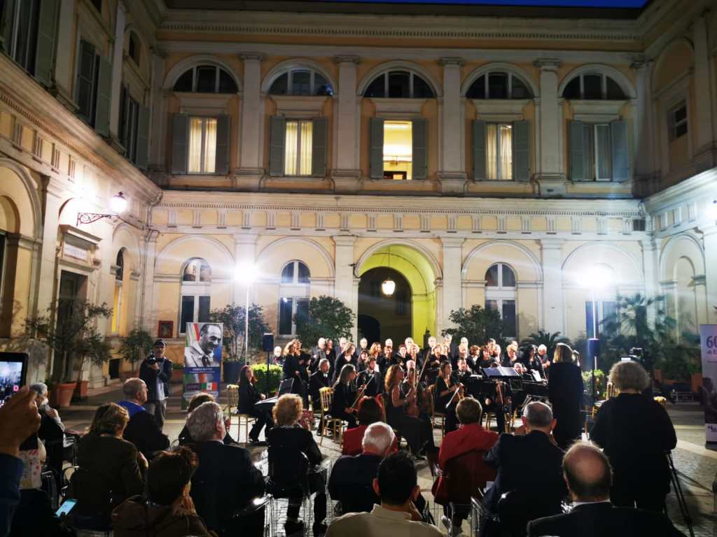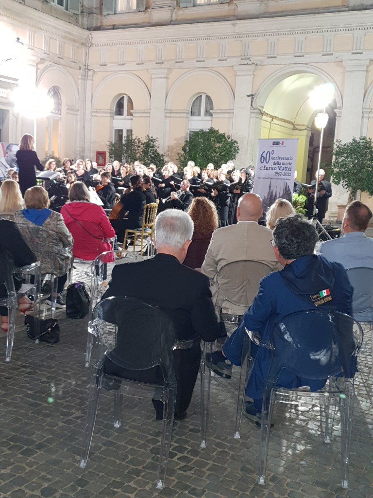 Alla chiusura del Convegno un meraviglioso concerto nella corte di palazzo Valentini, eseguito dal coro “Virgo Fidelis” del comando generale dei carabinieri, accompagnato dall’orchestra da camera “Ars Ludi” dell’International Music Institute. Nell’orario esatto della morte di Mattei, alle 18:57 si è rispettato un minuto di silenzio e di raccoglimento. Il concerto è terminato con l’Inno d’Italia.