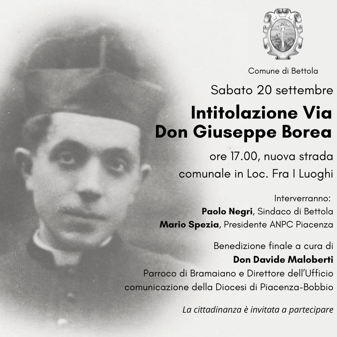 Sabato 20 settembre il Comune di Bettola (PC) intitolerà’ una via a don Giuseppe Borea, fucilato dai fascisti, dopo un processo farsa, il 9 febbraio1945 e per il quale ANPC Piacenza ha chiesto al Vescovo di Piacenza l’avvio del processo di beatificazione.
