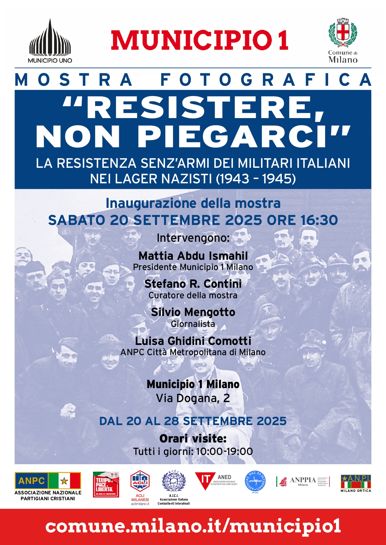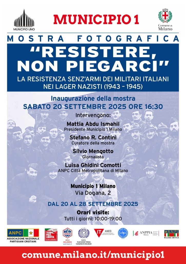 In collaborazione con il Comune di Milano, Municipio 1, l’Associazione Nazionale Partigiani Cristiani (ANPC) è lieta di inaugurare la mostra fotografica “Resistere, non piegarci”. La resistenza senz’armi dei militari italiani nei lager nazisti 1943-1945, organizzata in collaborazione con le ACLI milanesi, il Circolo ACLI «Giovanni Bianchi» di Milano-Lambrate e l’Associazione Italiana Combattenti Interalleati (AICI). L’obiettivo è ricordare la vicenda dei 650.000 Internati Militari Italiani (IMI), dopo la resa incondizionata dell’Italia l’8 settembre 1943, nel sistema concentrazionario nazista. La mostra sarà visitabile dal 20 al 28 settembre 2025 dalle ore 10:00 alle ore 19:00.